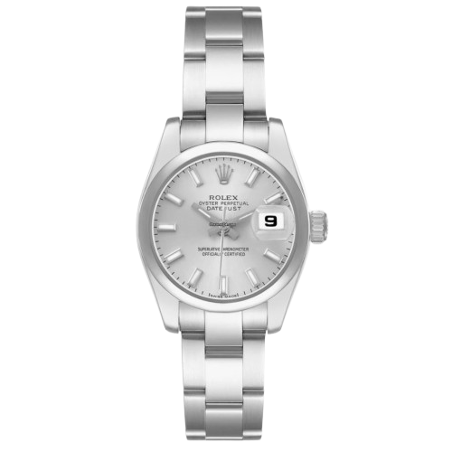 A classic 26mm timepiece featuring a smooth domed bezel and a clean silvery dial with elegant baton hour markers. Finished on a robust Oyster bracelet, this watch offers a timeless and versatile look with understated sophistication.