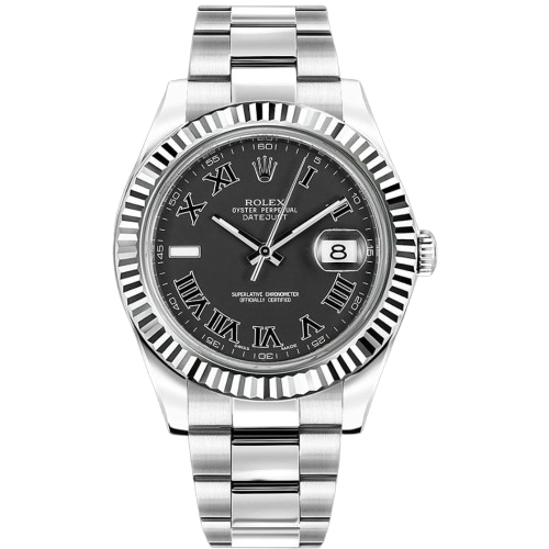 The Rolex Datejust II is a bold take on a classic design, featuring a larger 41mm stainless steel case, a fluted bezel, and an elegant dark dial with Roman numeral hour markers. The signature Cyclops lens magnifies the date for easy reading, while the automatic Rolex movement ensures precise and reliable timekeeping. Combining durability with timeless style, the Datejust II is designed to be worn effortlessly from everyday moments to more formal occasions.